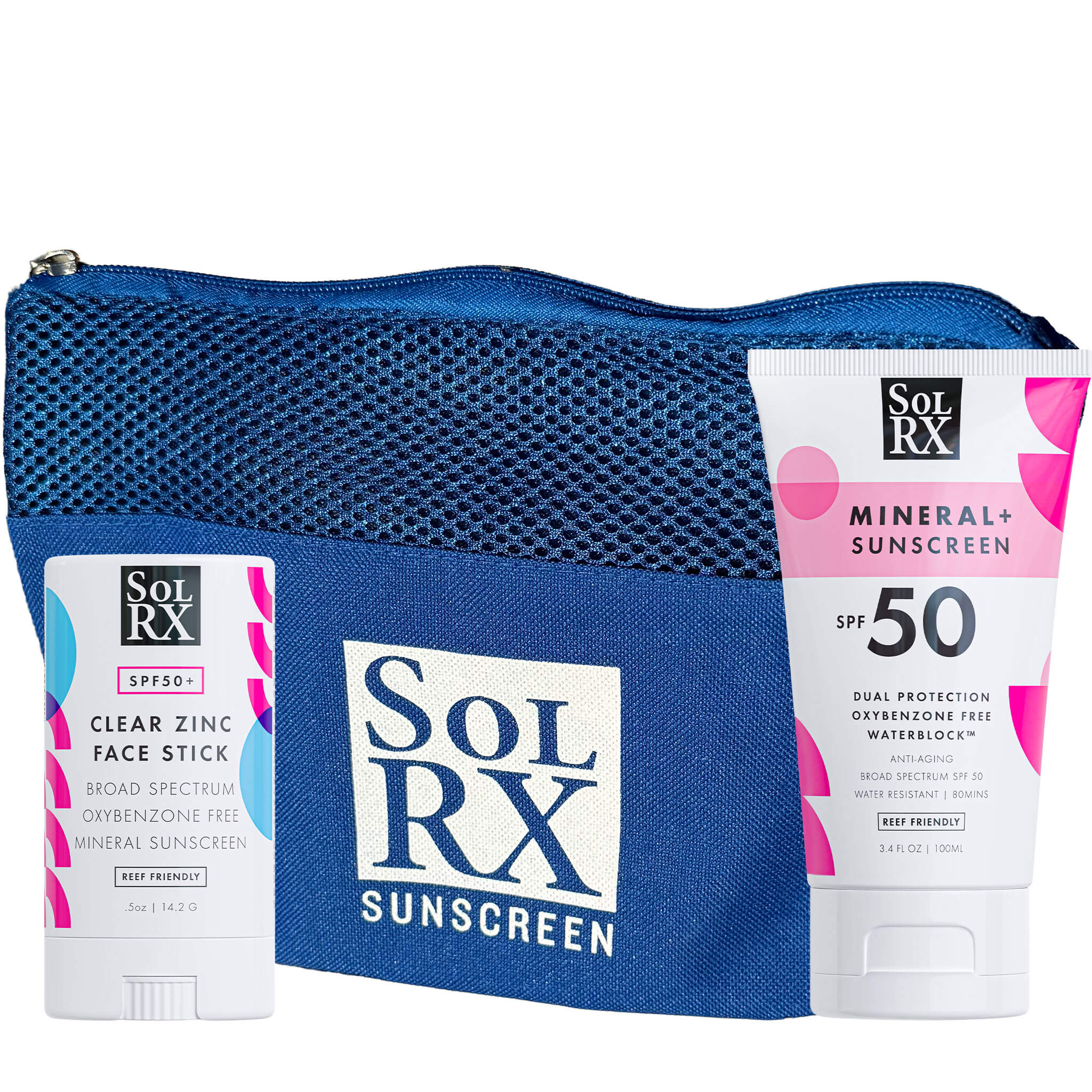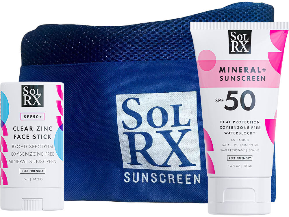 Pure mineral protection for sensitive skin. Gentle zinc formulas that deliver without compromise. This thoughtfully paired set includes Mineral SPF 50 Zinc Sunscreen 3.4oz, Clear Zinc SPF 50 Face Stick, Lemonade Lip Ice SPF 15, and a Premium Mesh Pouch.